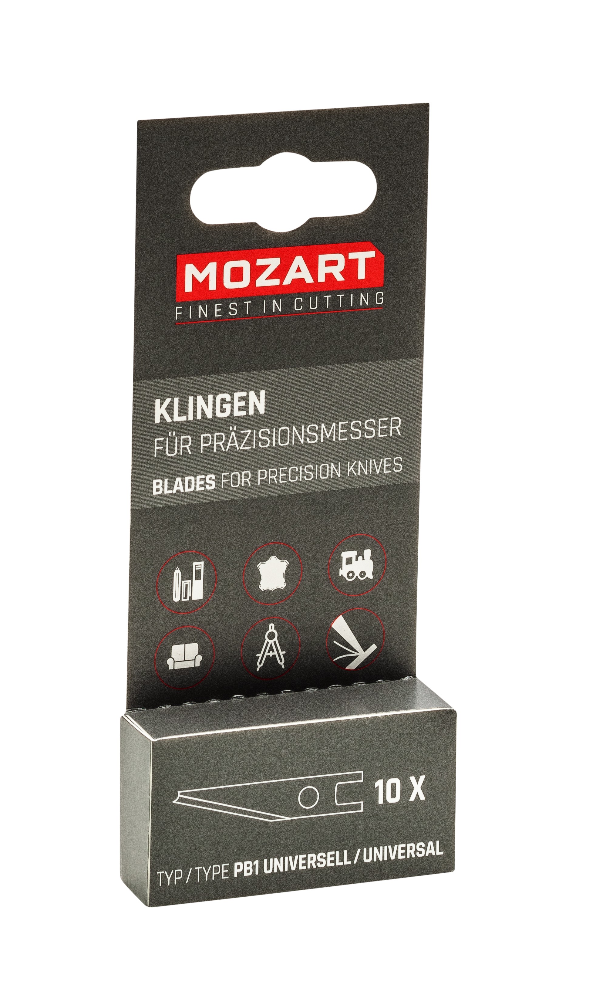 10 Präzisionsklingen "PB1 Universal" für Mozart Präzisionsmesser P1 und P2. In Sicherheitsdispenser auf Blisterkarte. 100% made in Solingen, Germany.