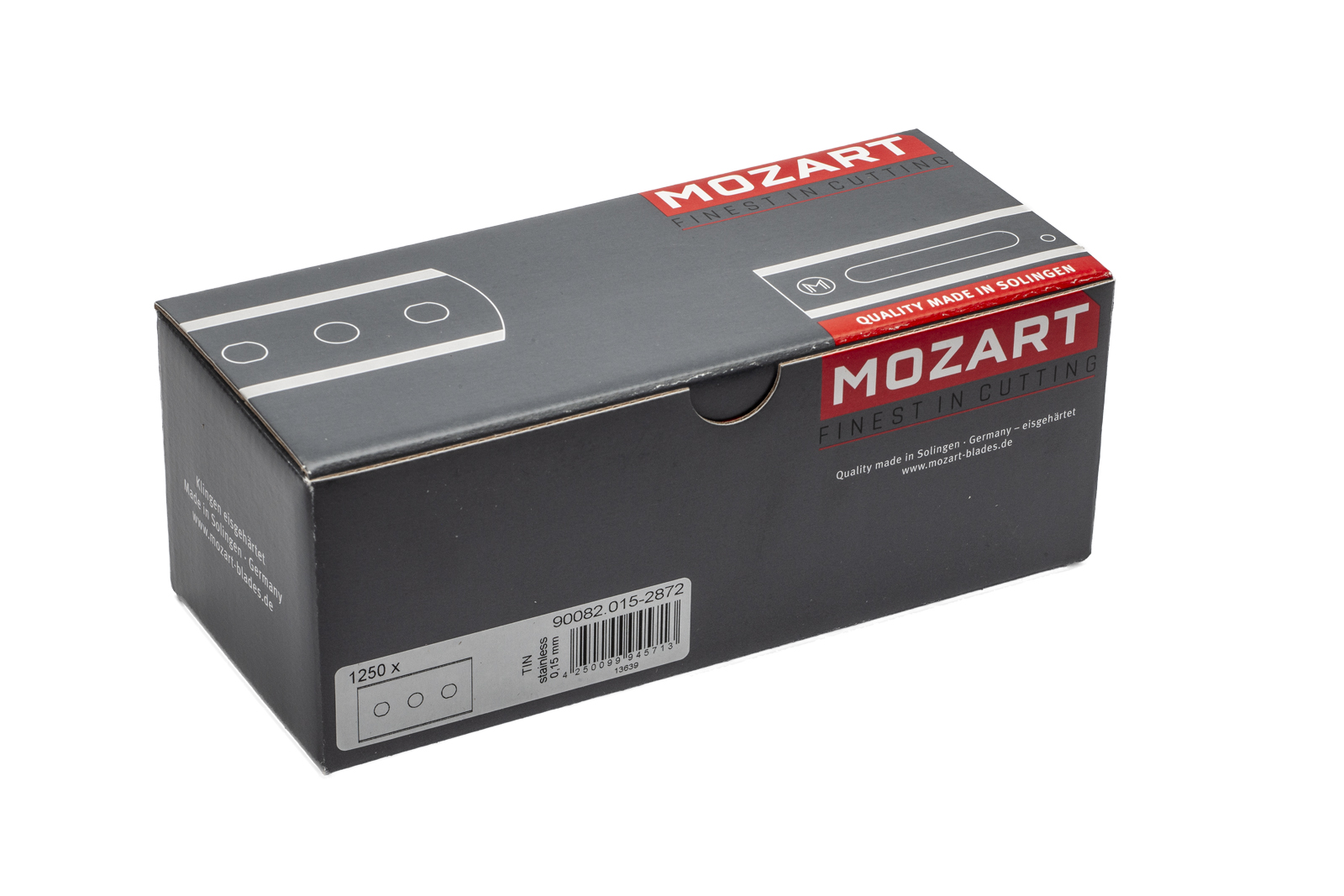 500 Industrieklingen 60 x 22 x 0,20 mm. Aus rostfreiem Stahl. Schneiden TiN-beschichtet für längere Standzeit. 25 Stück in Kunststoff-Box, 20 Boxen (= 500 Stück) in Umkarton. Made in Solingen, Germany.