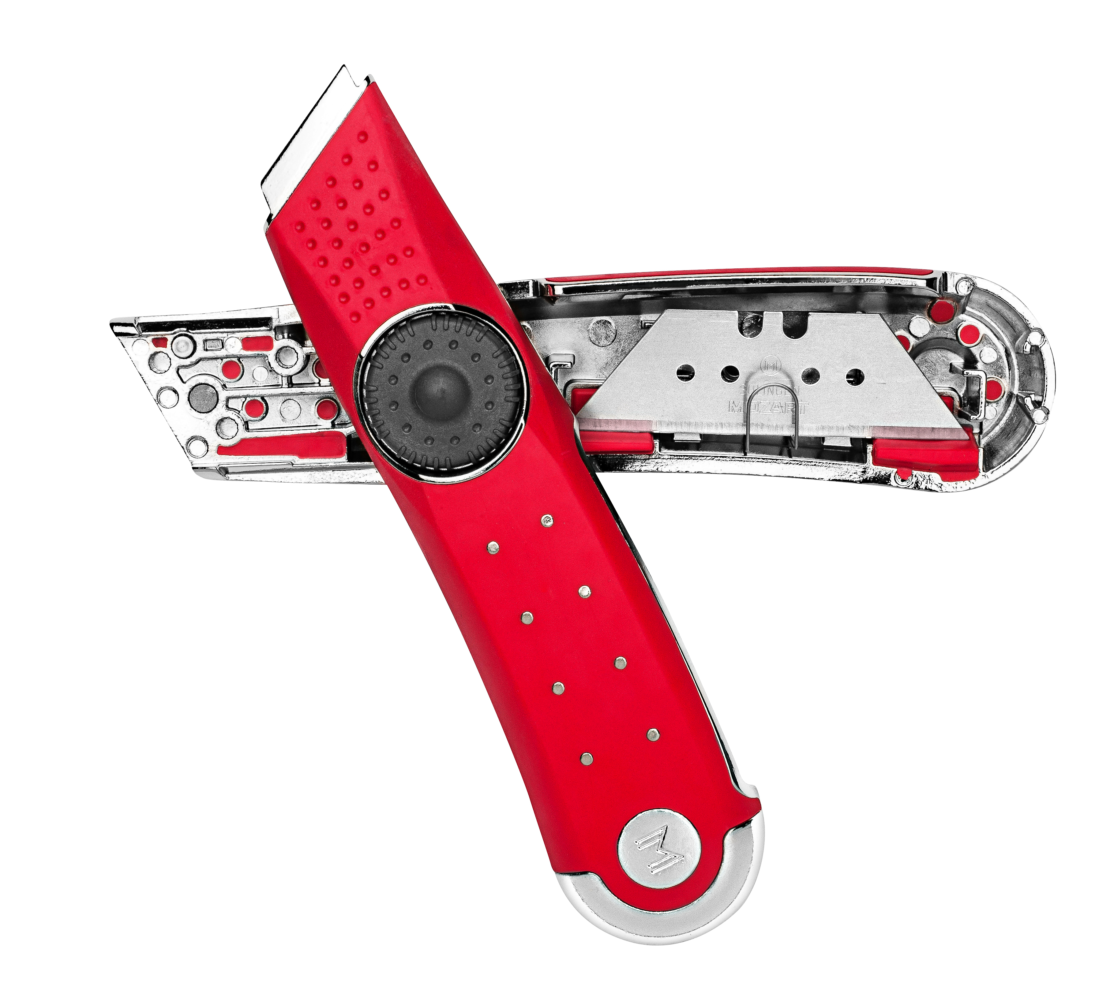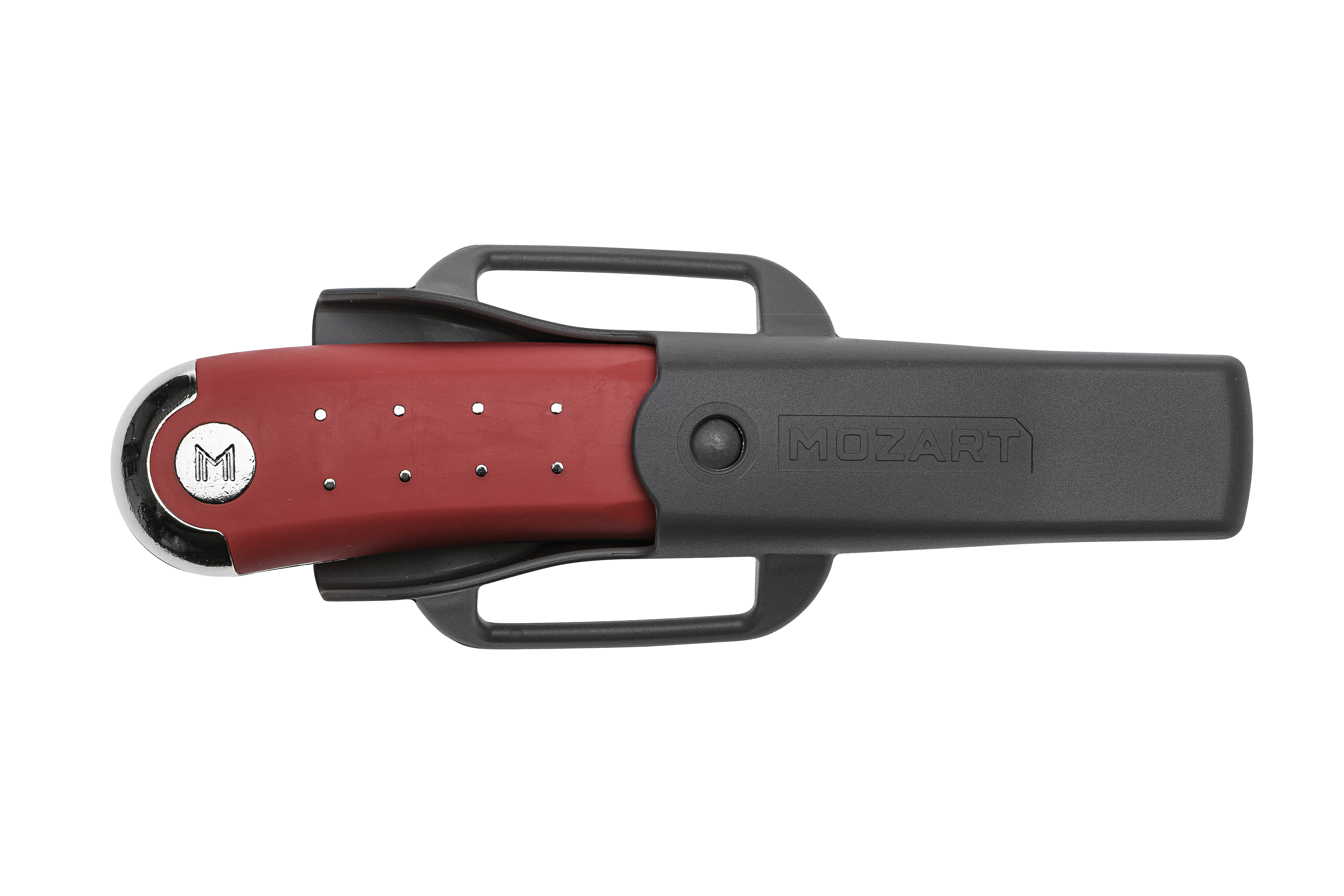 Mozart S2 Universalmesser für Handwerk (z.B. Bodenleger, Trockenbauer etc.), DIY und Hobby. Für Haken-, Trapez- und Halbmondklingen. Inkl. Kunststoffköcher für Gürtelbefestigung, und 1 x Trapezklinge 975.065. In Hängeschachtel. Made in Germany.